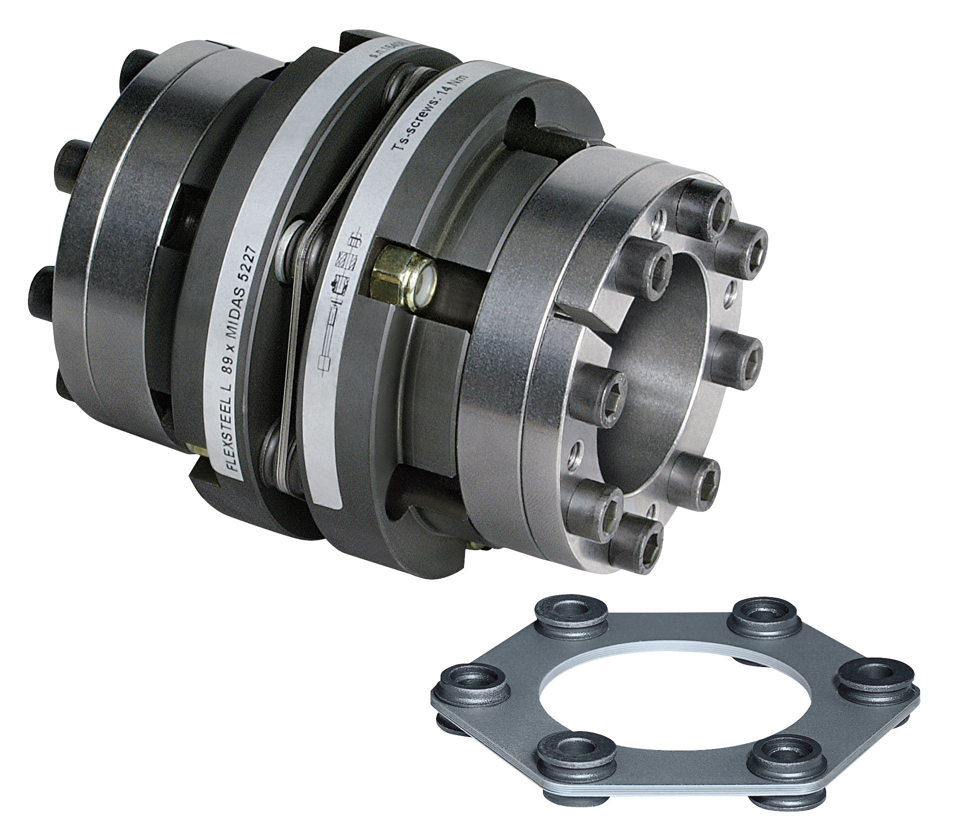 Flexsteel è un giunto a gioco zero che impiega come elemento di trasmissione un pacco di dischi in acciaio inossidabile, torsionalmente rigido, ma assialmente e angolarmente flessibile, per compensare disallineamenti fra due alberi.
